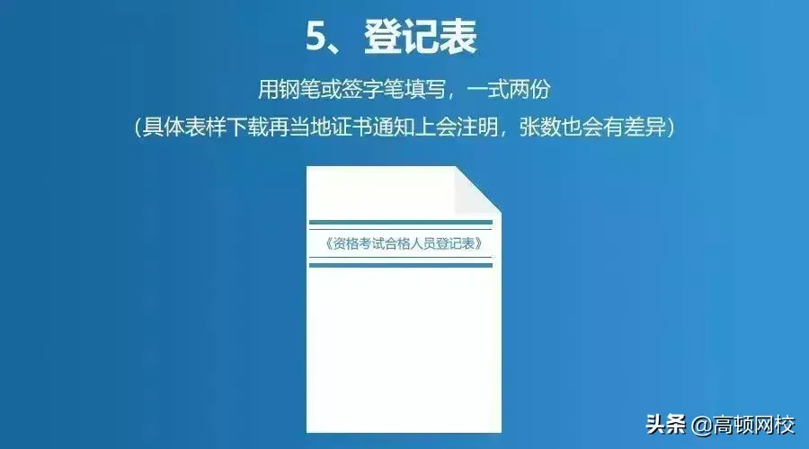 5、登记表:用钢笔或签字笔填写《资格考试合格人员登记表》一式二份(具体表样下载在当地证书通知上会注明,张数也会有差异,部分地区也取消了这张表)。