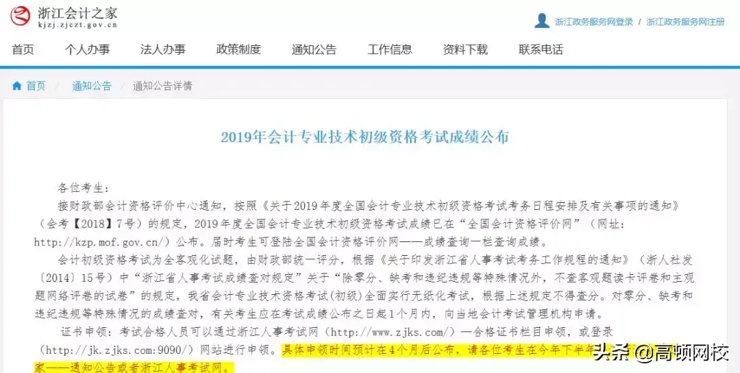 证书申领:考试合格人员可以通过浙江人事考试网(http://www.zjks.com/)—合格证书栏目申领,或登录(http://jk.zjks.com:9090/)网站进行申领。具体申领时间预计在4个月后公布,请各位考生在今年下半年关注浙江会计之家——通知公告或者浙江人事考试网。