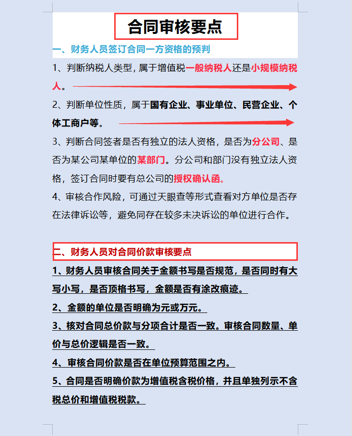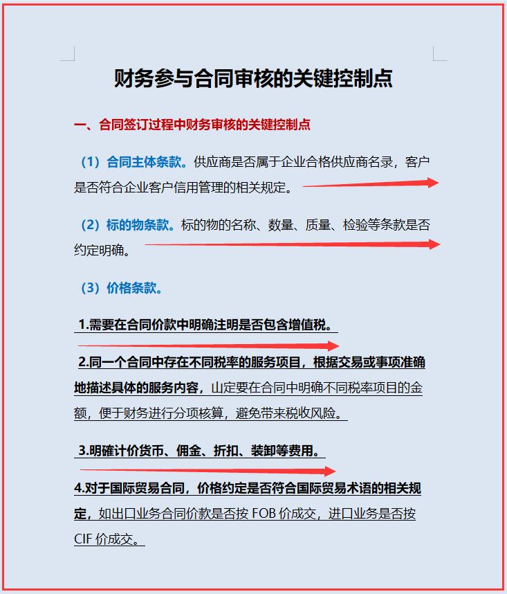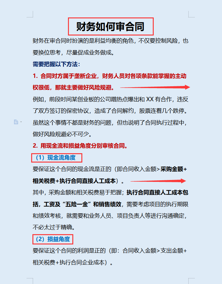 合同审核是财务人员提前接入业务,实现财务与业务融合的好方式,是财务管理的重要方式,是财务管理的重要手段,是规避各类风险的重要途径。