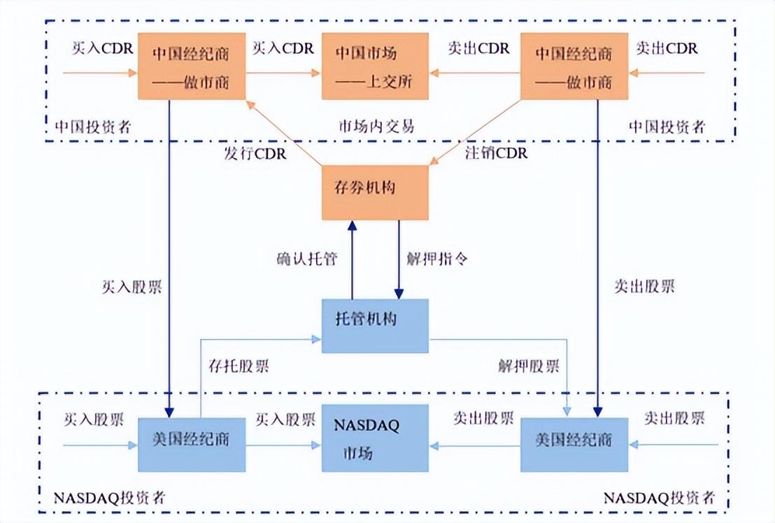 CDR的交易过程可以借鉴美国存托凭证(ADR)的过程,主要由国内外做市商、托管机构承担主要角色和中间桥梁,实现跨境市场间的交易。具体见下图: