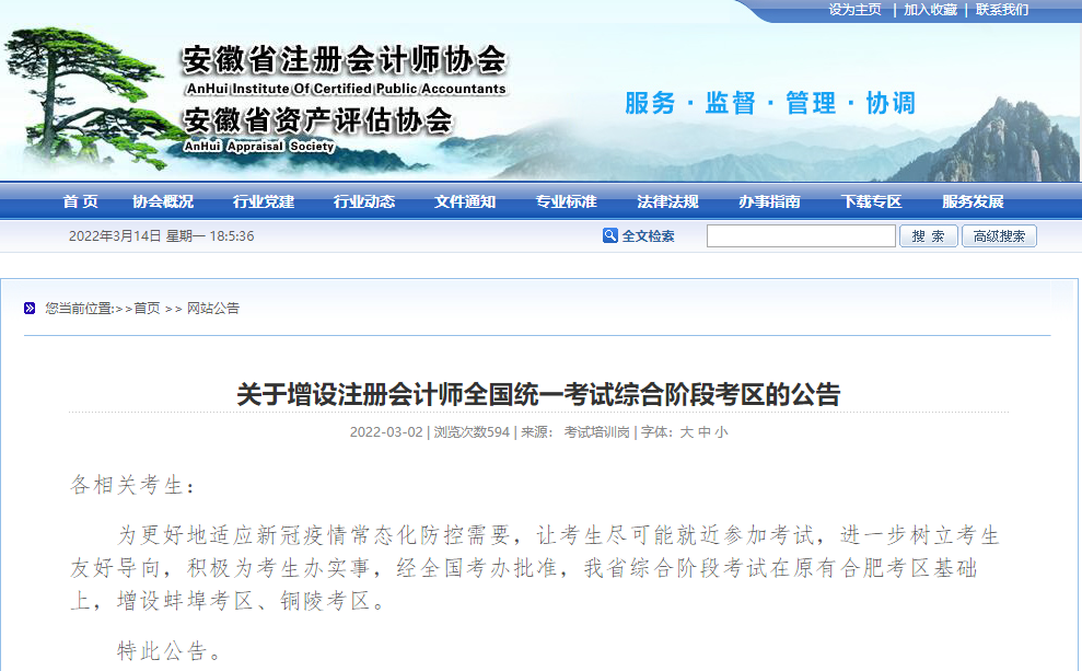 为进一步做好新冠肺炎疫情常态化防控下的注册会计师全国统一考试江苏考区工作,方便考生就近参加考试,更好地服务考生,为考生办实事,经财政部考办批准,我省综合阶段考试在原有南京考区基础上,自2022年起增设苏州考区。