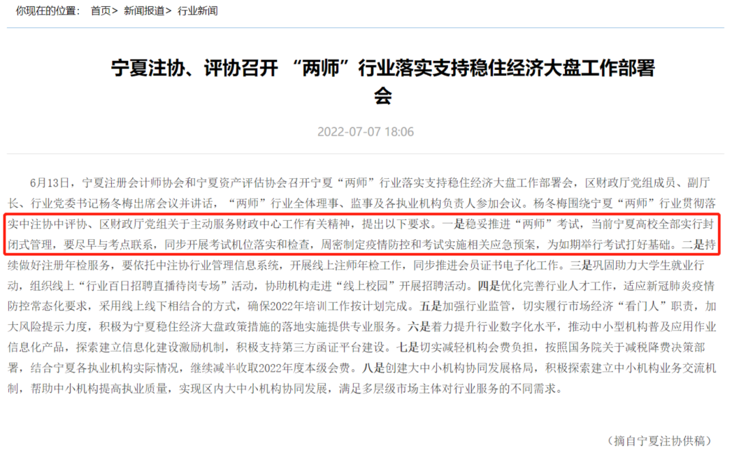 注册会计师协会和宁夏资产评估协会召开“两师”行业落实支持稳住经济大盘工作部署会。会上提出稳妥推进“两师”考试,