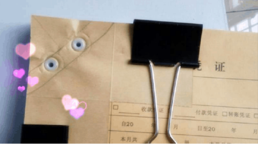 将第一次夹的夹子松开并再在原位置夹上,这次是将包角和凭证夹在一起。完成后,包角和凭证是被两个夹子一起夹着的,十分整齐和牢固。