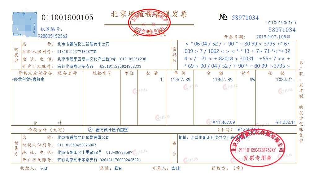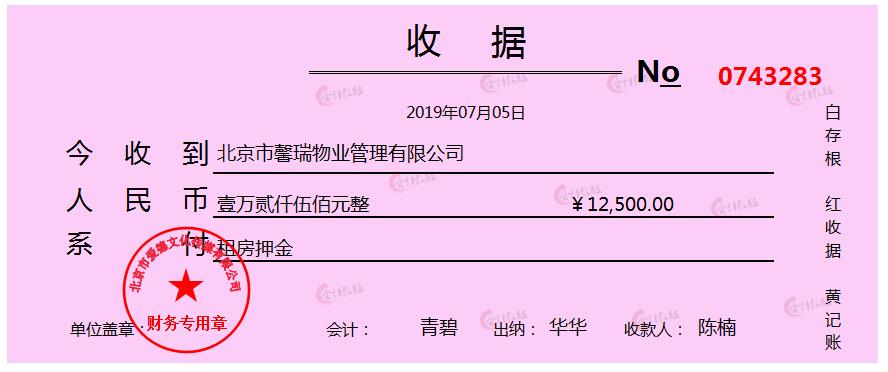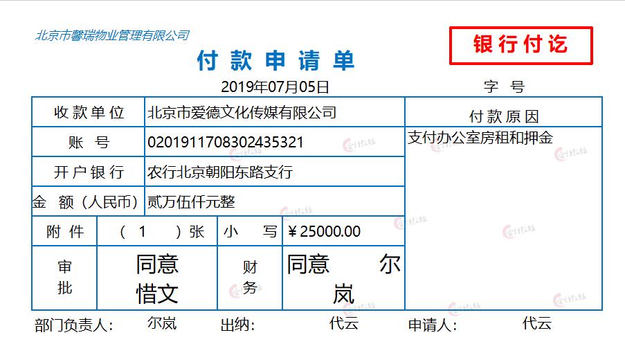 7月5日,出纳代云给北京市爱德文化传媒有限公司(办公室场地产权人)支付办公室租金,押金12500元,租金12500元(本月),网银转账支付。
