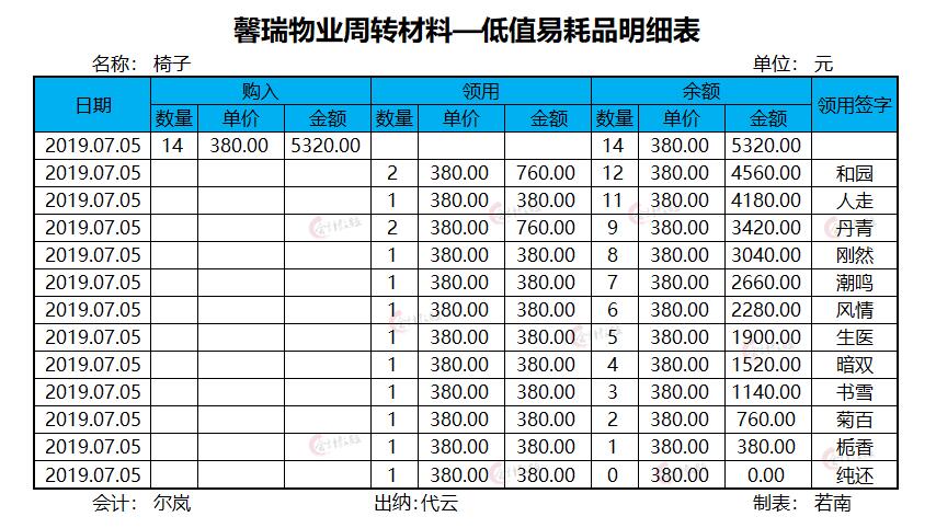 7月5日,维修部、技术部、保安部、保洁部领用桌椅,并按实际领用的金额摊销(领用清单附后)。