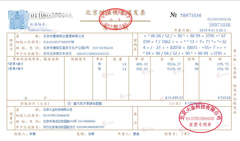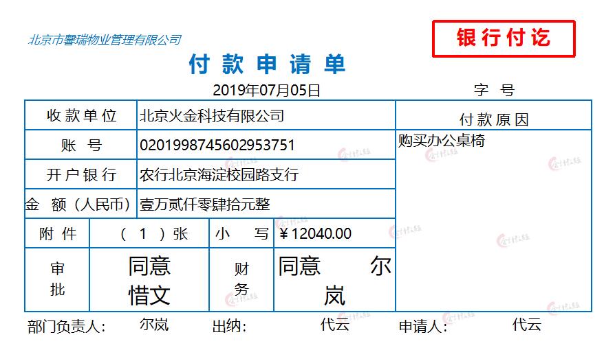 7月5日,出纳代云申请购买办公桌椅电脑,桌子6720元,椅子5320元,联想电脑28500元,网银转账支付。