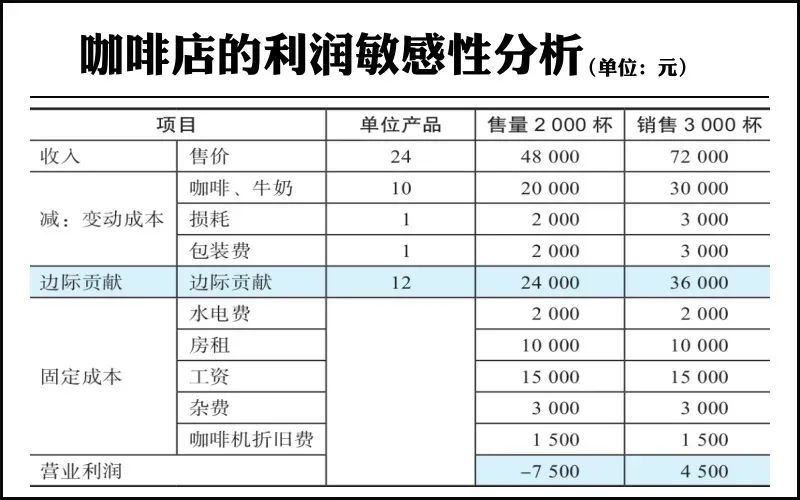 边际贡献是一个管理会计的概念,对于利润的敏感性分析非常有用。比如,如果我们想分析卖2000杯咖啡和3000杯咖啡对利润有什么影响,就要用边际贡献的概念。下表是咖啡店的利润敏感性分析。
