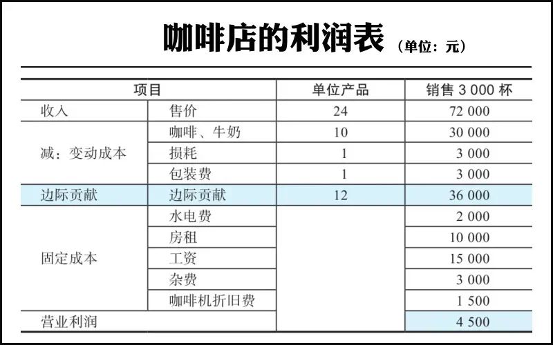 为了推导出盈亏平衡点销售量的公式,我们还要讲两个概念:变动成本和边际贡献。下表是一家咖啡店的利润表。
