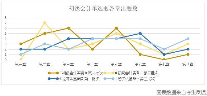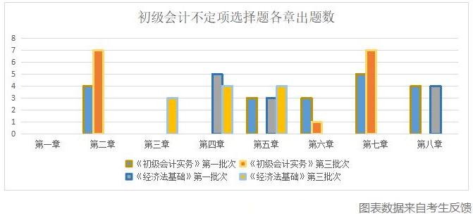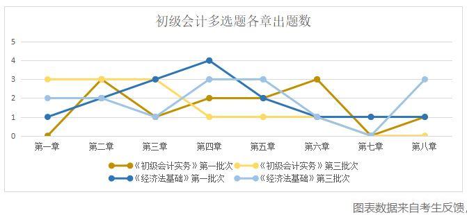 如下图,单独看某一批次,一些章节没有在试卷中用多选题的方式进行考查,如《初级会计实务》第一批次没有考查第一章,《经济法基础》第三批次没有考查第七章,但整体观察,各章节的内容均出现在试卷中,因此,对考生来说,全面学习,才是最安全的备考之道。