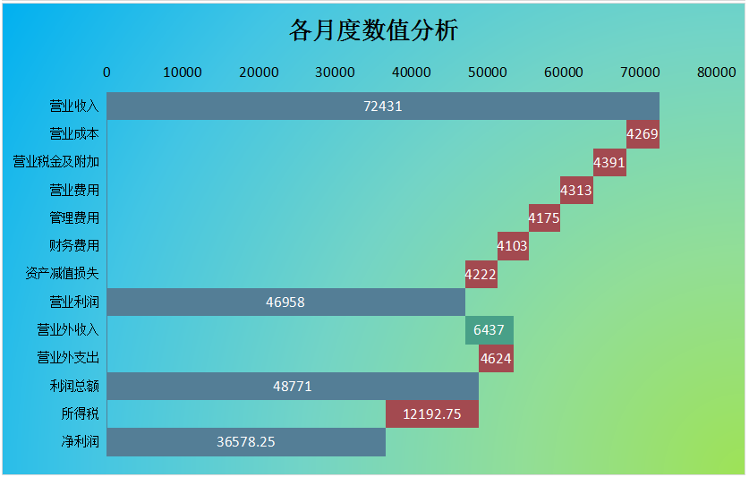 这份财务利润表分为4个板块:各类项目月度数据、各月度项目数据分析图表、各项目月度数据分析图表、各月度数值分析;