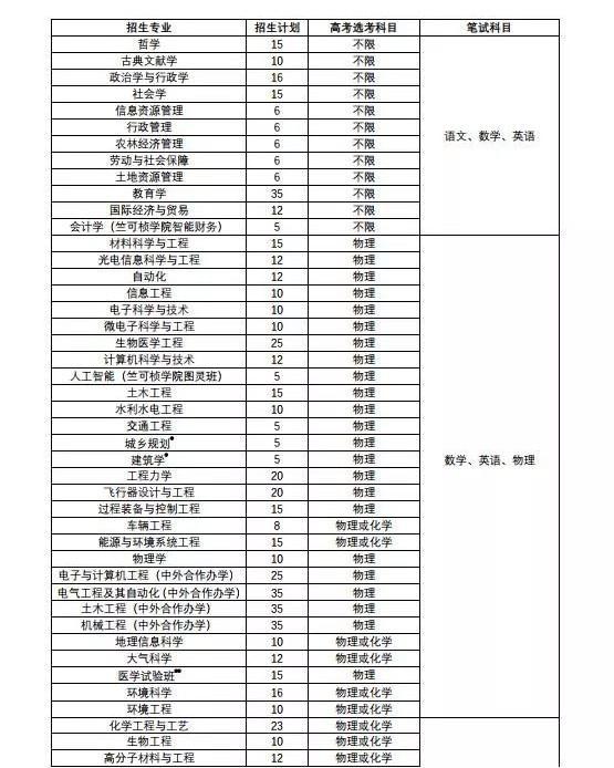 我校2019年浙江省“三位一体”综合评价招生总计划800名。按专业招生,各专业招生计划、高考选考科目要求及笔试科目详见下表。