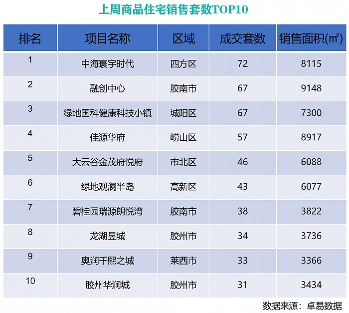 另外,上周还有佳源华府、大云谷金茂府悦府、绿地观澜半岛、碧桂园瑞源朗悦湾、龙湖昱城、奥润千熙之城以及胶州华润府分别成为当周单盘销售榜单的第四到第十名。