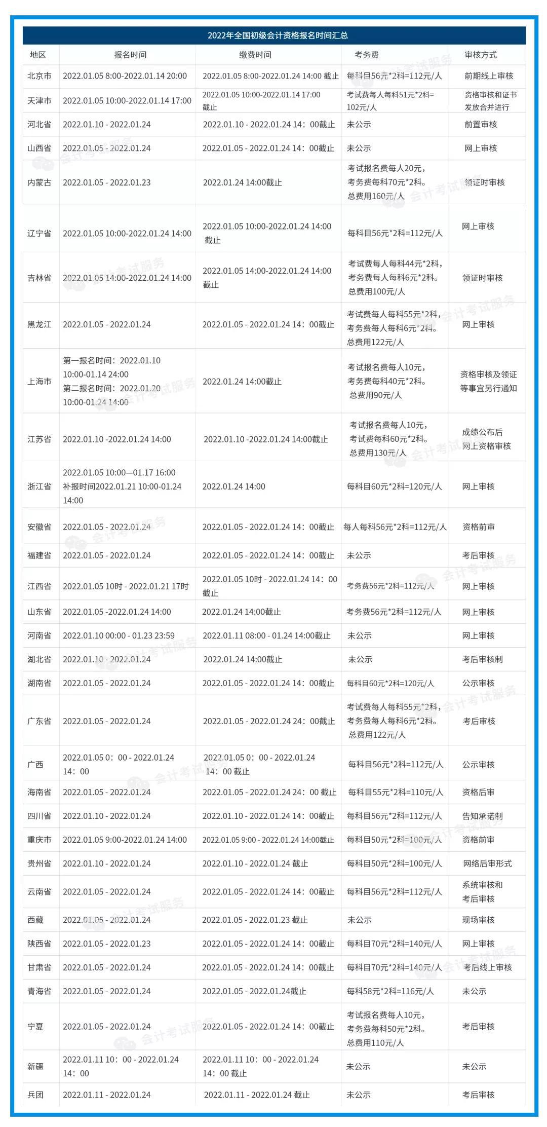 2022年初级各省报名时间不统一,大部分地区1月5日即可报名,少部分地区1月10日开始报名,详情如下: