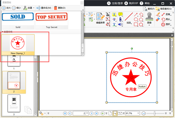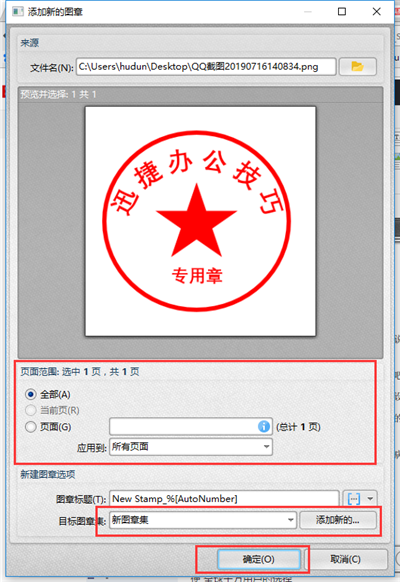 接下来我们选择应用范围,创建【新图章集】,点击确定我们就可以在图章调板看到我们的图章了~点击它,再放到我们的PDF文件里就可以啦!