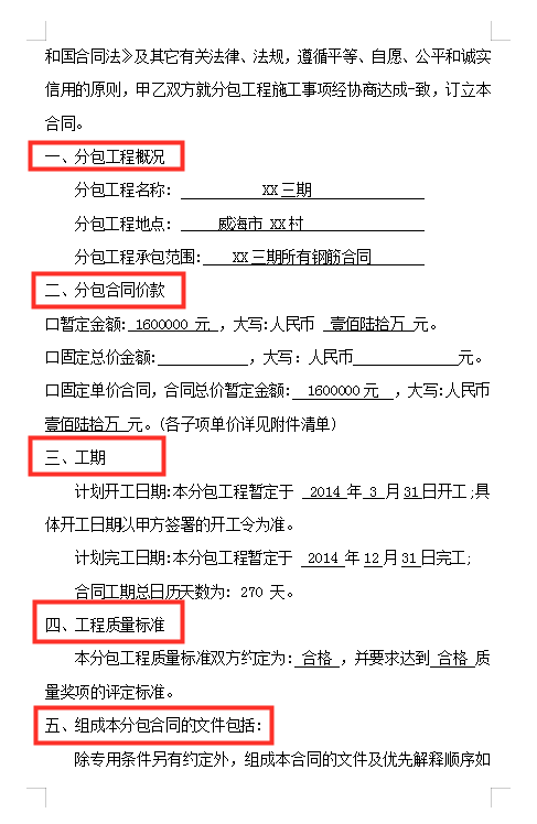 对劳务分包方面的施工来说,劳务分包合同和施工合同就至关重要了。签订施工合同,必须遵守国家法律,符合国家政策,并具备经批准的承包工程的初步设计和总概算,承包工程所需的投资和统配物资已经列入国家计划,当事人双方均有履行合同的能力等基本条件,以保证施工合同切实可行。