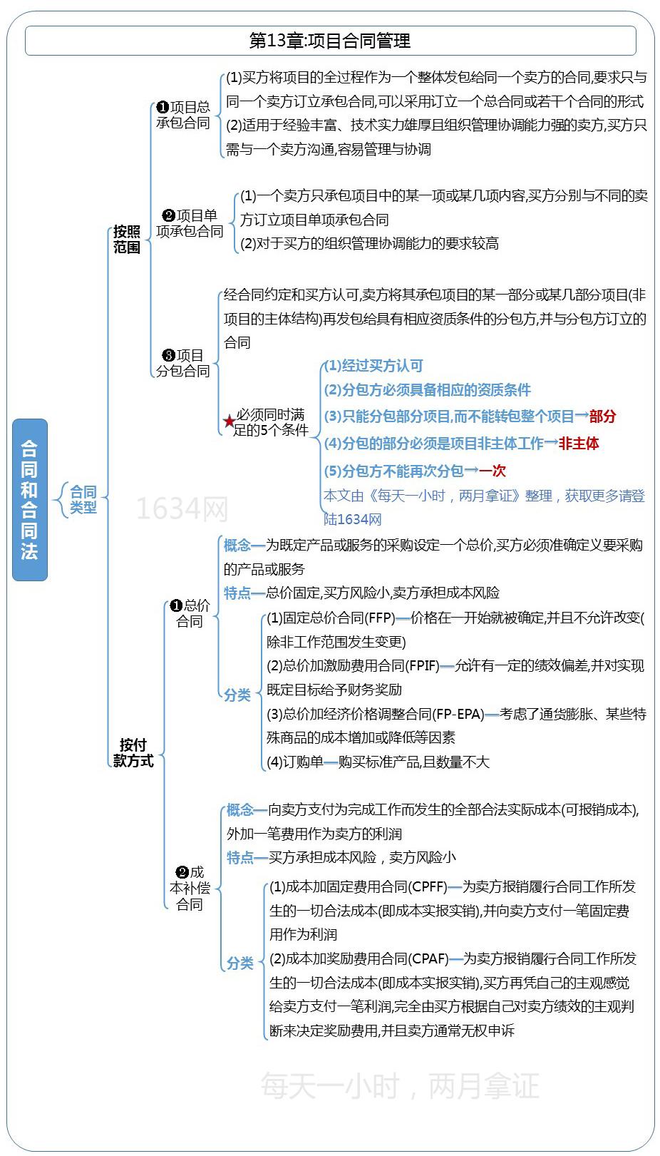 (1)经过买方认可(2)分包方必须具备相应的资质条件(3)只能分包部分项目,而不能转包整个项目→部分(4)分包的部分必须是项目非主体工作→非主体(5)分包方不能再次分包→一次本文由《每天一小时,两月拿证》整理,获取更多请登陆1634网二、按付款方式