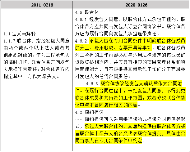 9.细化了联合体模式承包工程的关键内容,为当下市场大量联合体模式承接项目提供引导和借鉴。在《房屋建筑和市政基础设施项目工程总承包管理办法》要求工程总承包商应当同时具备工程相应的设计与施工双资质的背景下,市场上存在大量设计单位与施工单位组成联合体承接工程的模式,按照《建筑法》《招标投标法》等法律规定,联合体对合同履行承担连带责任,加之联合体内部的分工配合、设计施工的融合、工程款的支付流转程序、发票开具、对外分包、牵头人管理费等事项,在法律层面均无明确指引,均需通过各方合同约定来明确,但在2011版合同中并无具体体现,令联合体在实践中面临复杂而严峻的法律问题。新版合同在[4.6联合体]条款及相关条款中提纲挈领地对联合体应当明确的事项进行了指引,例如签订联合体协议作为合同附件,以及在专用条款中约定联合体各成员的分工、费用收取、发票开具、履约担保提交等事项,便于合同双方在专用条款及联合体协议中就相关事项结合项目实际情况进一步约定,对联合体模式承接工程起到一定的规范作用。
