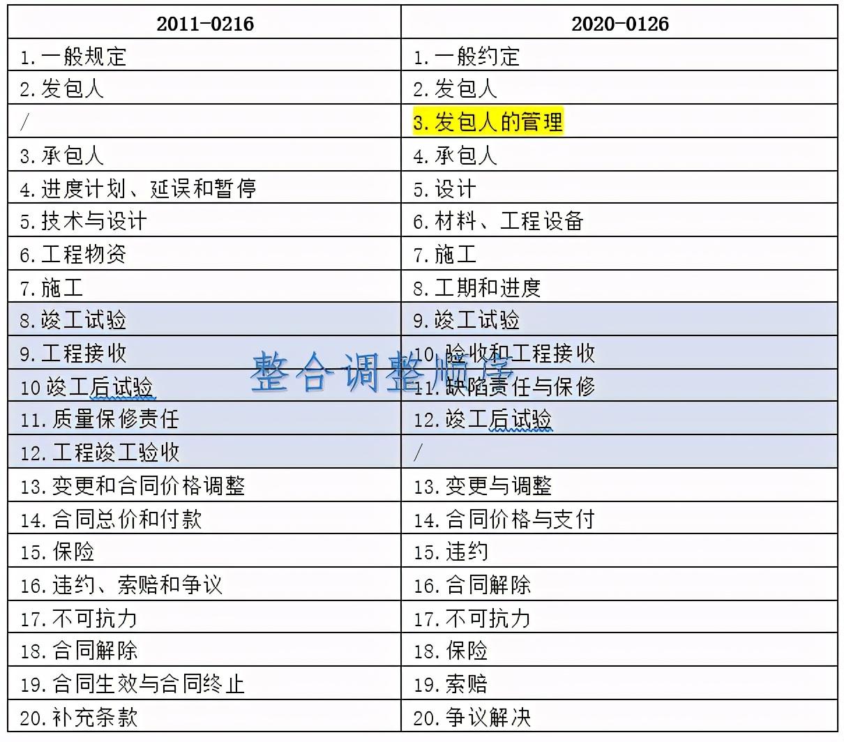 1、合同体例上新增[第3条 发包人的管理]:从示范文本的整体架构上而言,新版合同共20个条款,增加了1个条款(2011版合同虽同为20条,但第20条为“补充条款”,留白待当事人补充,因此2011版合同通用条款具备实质性内容的实际为19个条款),将“发包人的管理”从原2011版合同[第2条 发包人]中单独列出,并考虑了当下全过程工程咨询角色的孵化、发包人委托的其他专业人员或咨询机构的参与建设等,形成了新合同版本中的[第3条 发包人的管理]。此外,新版合同结合行业实践重新梳理了从工程竣工试验到竣工后试验的流程顺序,整合并调整了工程竣工验收、工程接收、缺陷责任与保修、竣工后试验等几个主要条款的先后次序。