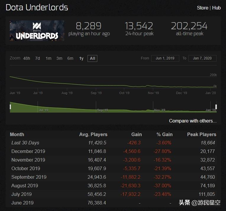 自走棋品类另一款热门游戏《刀塔霸业》,同样出现了玩家数量锐减的情况。截止今年1月7日,这款游戏的单日在线顶峰值不足1.4万人,还不到6月开服时最高同时在线人数20万的10%。