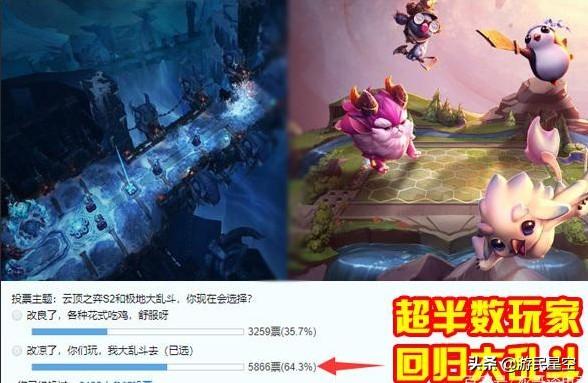 《云顶之弈》进入S2版本阶段,有媒体报道称此次大幅改动,导致玩家大量流失,最高在线人数相比S1赛季下跌了50%。而网上关于“云顶之弈S2和极地大乱斗,你现在会选择哪个”的投票中,5666票占比64.3%的玩家选择离开云顶之弈去玩大乱斗。