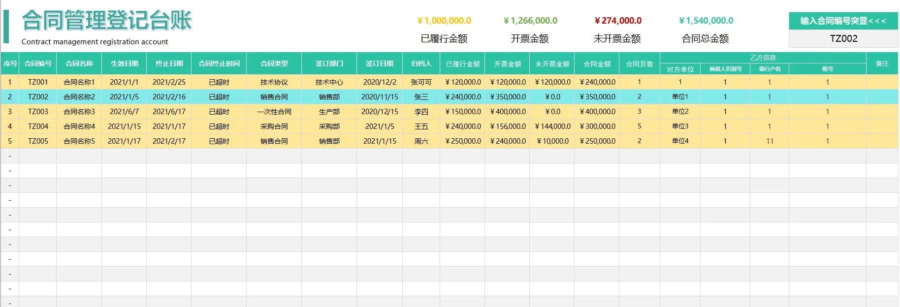 合同管理是当下财务人的日常工作,今天分享合同管理台账表,帮助大家更好的整理合同。表格数据自动汇总、观看更清晰、还带查询功能可颜色变色