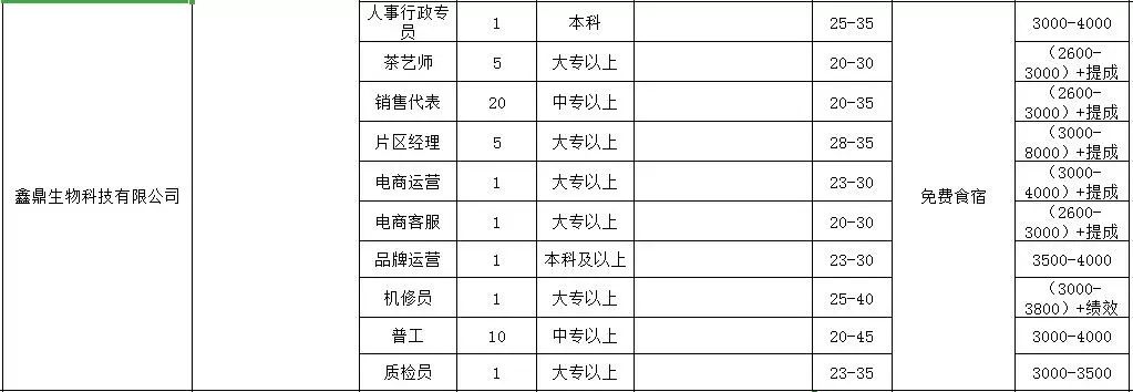 鑫鼎生物科技有限公司:人事行政专员、茶艺师、销售代表、片区经理、电商运营、电商客服、品牌运营、机修员、普工、质检员