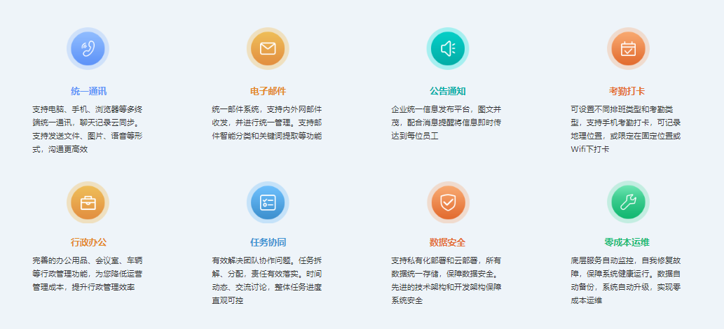 协众软件内嵌私有化即时通讯和41项强大功能OA工作台,是一款面向各个行业企业/事业单位的协同管理软件,主要包含协同办公自动化软件、协同运营管理系统、政务办公OA(办公自动化)系统等,让企事业单位的沟通办公更安全,而且免安装插件可支持WPS /office 等办公软件在线浏览,修改,系统以强大的工作流程为特色,拥有工作流程、工作报表、文件管理、公文管理、项目管理(PMP)、行政办公、人事管理(HR)、客户管理(CRM)、库存管理、资产管理和信息管理等41项办公系统必备功能。