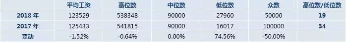 低位数上升了11943,中位数持平,高位数下降3467,高低位薪酬之间的差距与从去年的34倍升下降到19倍。