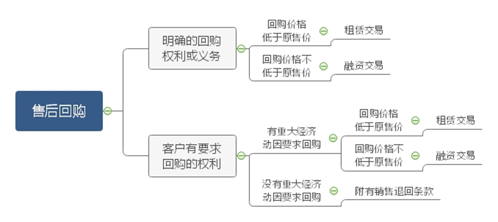 (一)企业因存在与客户的远期安排而负有回购义务或企业享有回购权利的,表明客户在销售时点并未取得相关商品控制权,企业应当作为租赁交易或融资交易进行相应的会计处理。其中,回购价格低于原售价的,应当视为租赁交易,按照《企业会计准则第21号——租赁》的相关规定进行会计处理;回购价格不低于原售价的,应当视为融资交易,在收到客户款项时确认金融负债,并将该款项和回购价格的差额在回购期间内确认为利息费用等。企业到期未行使回购权利的,应当在该回购权利到期时终止确认金融负债,同时确认收入。
