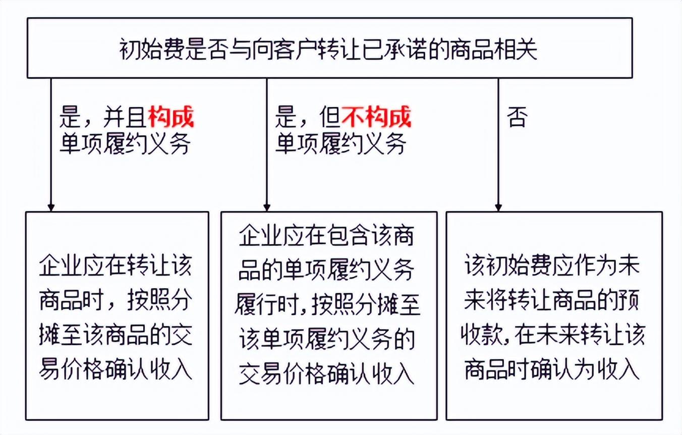 第四十条 企业在合同开始(或接近合同开始)日向客户收取的无需退回的初始费(如俱乐部的入会费等)应当计入交易价格。企业应当评估该初始费是否与向客户转让已承诺的商品相关。该初始费与向客户转让已承诺的商品相关,并且该商品构成单项履约义务的,企业应当在转让该商品时,按照分摊至该商品的交易价格确认收入;该初始费与向客户转让已承诺的商品相关,但该商品不构成单项履约义务的,企业应当在包含该商品的单项履约义务履行时,按照分摊至该单项履约义务的交易价格确认收入;该初始费与向客户转让已承诺的商品不相关的,该初始费应当作为未来将转让商品的预收款,在未来转让该商品时确认为收入。