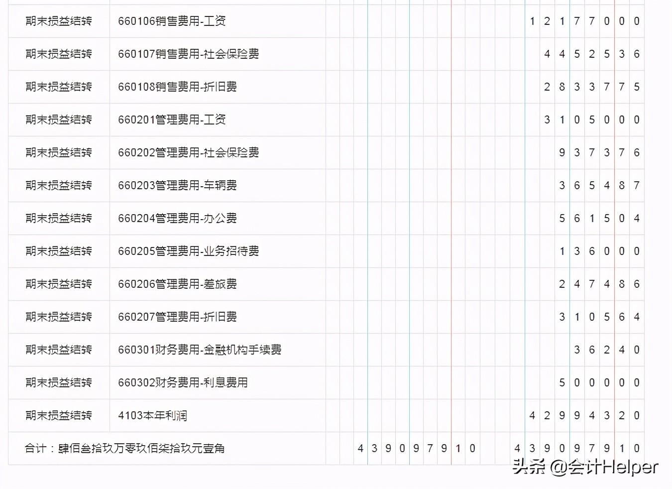 期末损益结转,其中主营业务收入4313782.74元,主营业务成本3643175.00元,其他业务收入77196.36元,税金及附加9942.82元,管理费用56634.17元,销售费用245921.51元,财务费用5362.40元。