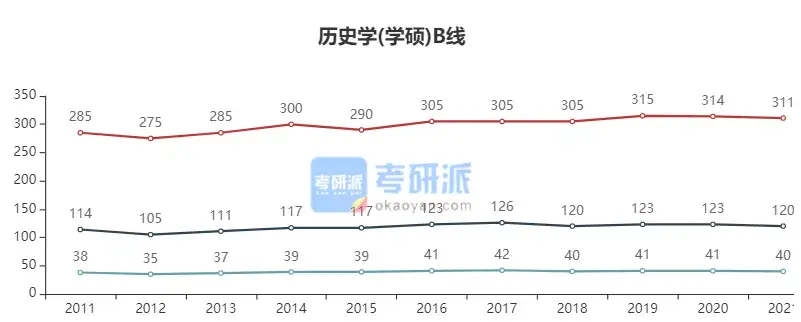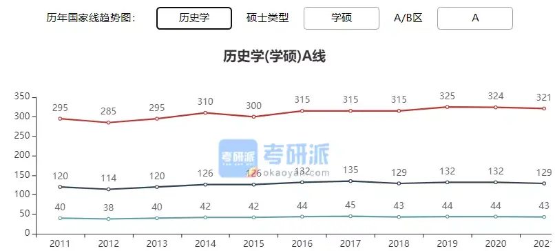 2017年-2018年总分维持在315分,2019年总分为325分,从2020年-2021年处于降幅趋势,说明历史学的难度越来越大了,即使报考人数越来越多,但是历史学国家线的涨幅阈值为325分(A区)和315分(B区),所以今年超过325分(A区)和315分(B区)的可能性非常小,大概率今年历史学国家线会保持降幅趋势,为1分左右,或持平。