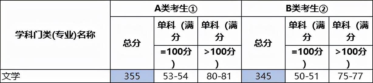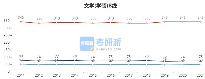 2019年-2021年的单科线保持上涨趋势。按道理单科线上涨势必会导致总分也会上涨,但是这3年没有上涨,说明360分(A区)和350分(B区)为文学专业的阈值,通过对单科线的上涨来改变文学国家线的走势。即使今年总分不会出现上涨趋势,但是单科线大概率会出现上涨趋势,涨幅为1分-2分。