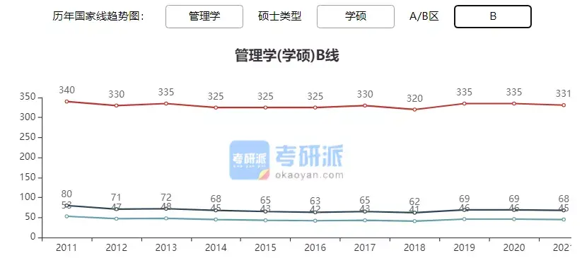 纵观前几年的总分趋势可以发现,350分(A区)和340分(B区)基本上是国家线的阈值,如果某年超过了这个阈值,只能说明考研的人数会持续飙升,高校招生计划名额在不断增加,试卷难度在慢慢降低。