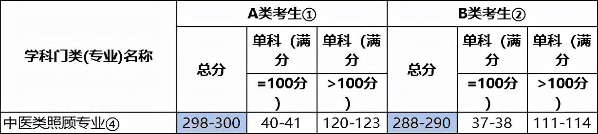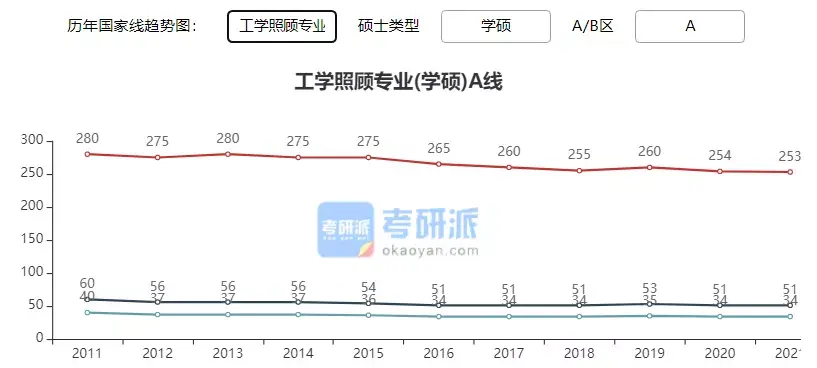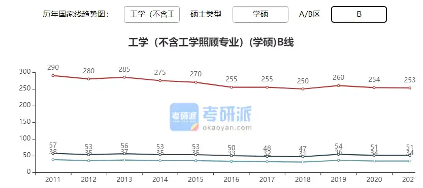 工学照顾类专业和工学国家线的变化趋势一样,只是在工学国家线总分的基础上低10分,单科=100分的分数线不低于34分(A区)和31分(B区),单科>100分的分数线不低于51分(A区)和47分(B区)。