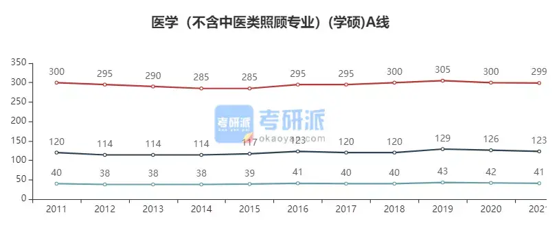 纵观医学这5年的国家线可知,2017年-2019年国家线出去涨幅趋势,2020年-2021年处于降幅趋势,从2019年-2020年降幅为5分,2020年-2021年降幅为1分。