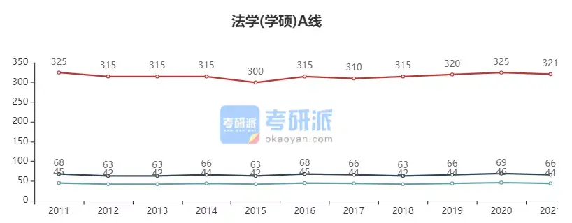 7.【法学】和【法律(非法学)、法律(法学)、社会工作、警务】国家线分析及预测7.1 2011-2021年【法学】和【法律(非法学)、法律(法学)、社会工作、警务】国家线: