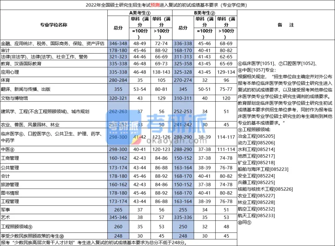 2022年全国硕士研究生招生考试预测进入复试的初试成绩基本要求