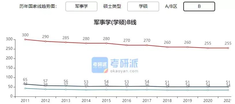 纵观军事学历年国家线,可以看出,国家线一直处于降幅趋势。从2020年开始,国家线维持在265分(A区)和255分(B区),预测今年的军事学和军事专业国家线也会与去年持平。