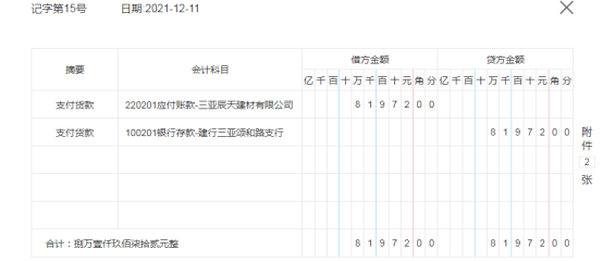 12月11日,银行转账支付辰天建材有限公司石子款81972.00元。