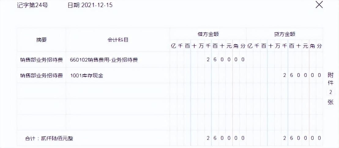 12月15日,销售部门张波报销招待客户餐费2600元,出纳以现金付讫。