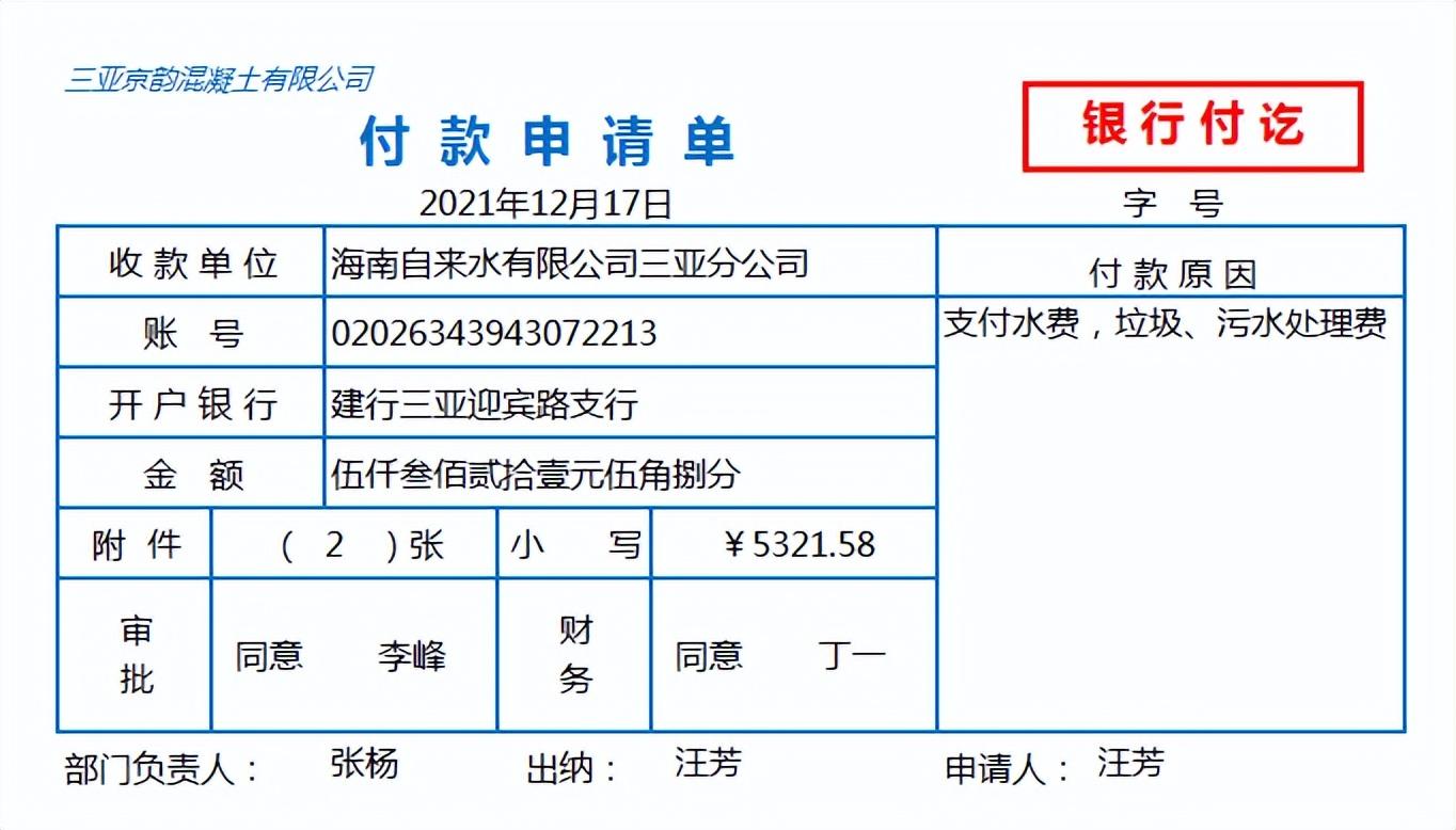 12月17日,支付水费,垃圾、污水处理费共计5321.58元(其中水费2855.48元,垃圾处理费1038.36元,污水处理费1427.73元),出纳以银行付讫。