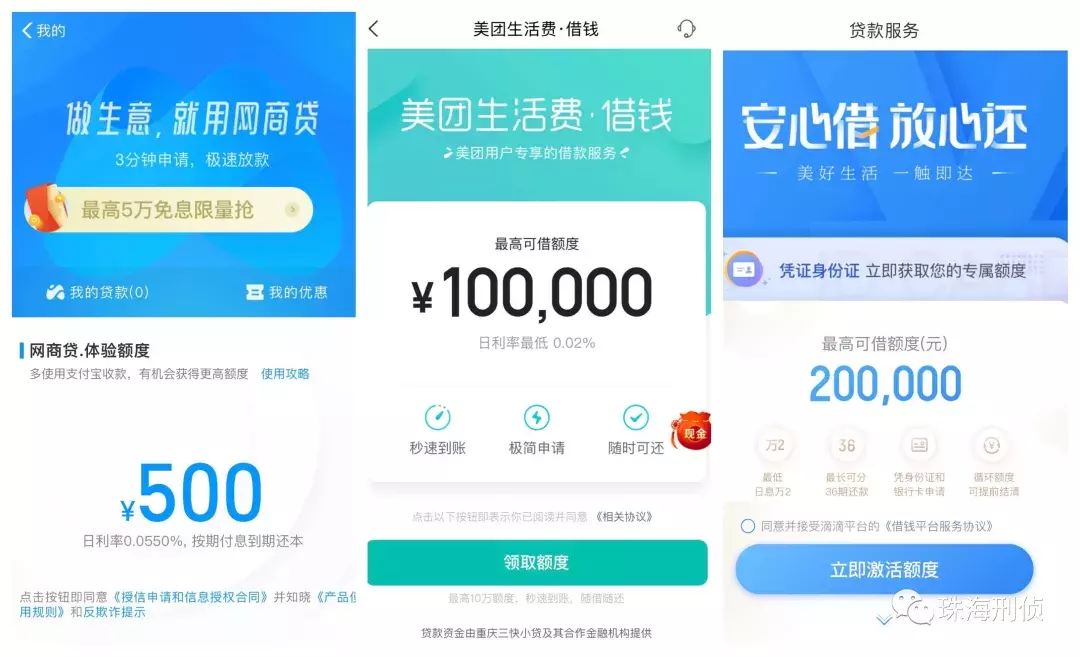 从左至右依次是:支付宝网商贷、美团借钱、滴滴借钱