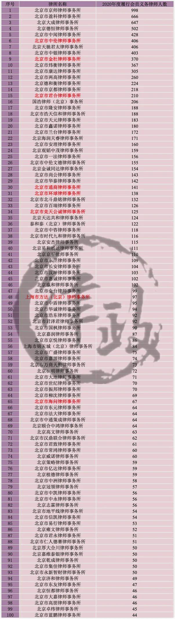 我们在此选取了截至2020年8月10日规模排名前一百的律师事务所,供大家参考: