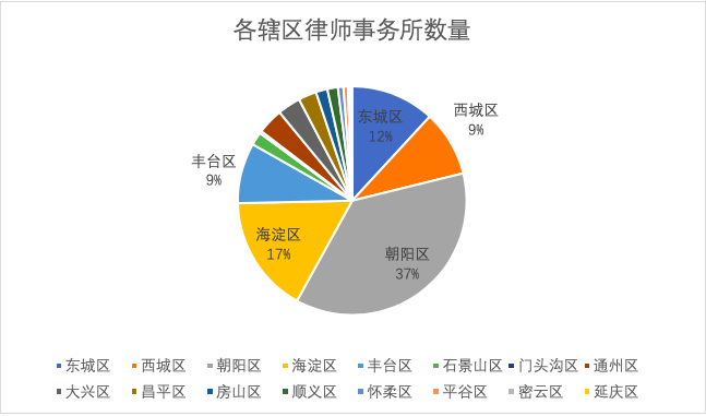 根据北京市律师协会公布的数据,2020年东城区共319家律师事务所,西城区共250家律师事务所,朝阳区共992家律师事务所,海淀区共447家律师事务所,丰台区共230家律师事务所,石景山区共50家律师事务所,门头沟区共9家律师事务所,通州区共98家律师事务所,大兴区共88家律师事务所,昌平区共69家律师事务所,房山区共44家律师事务所,顺义区共40家律师事务所,怀柔区共21家律师事务所,平谷区共17家律师事务所,密云区共8家律师事务所,延庆区共8家律师事务所。从数据上来看,朝阳区的律师事务所在数量上占据着压倒性优势。