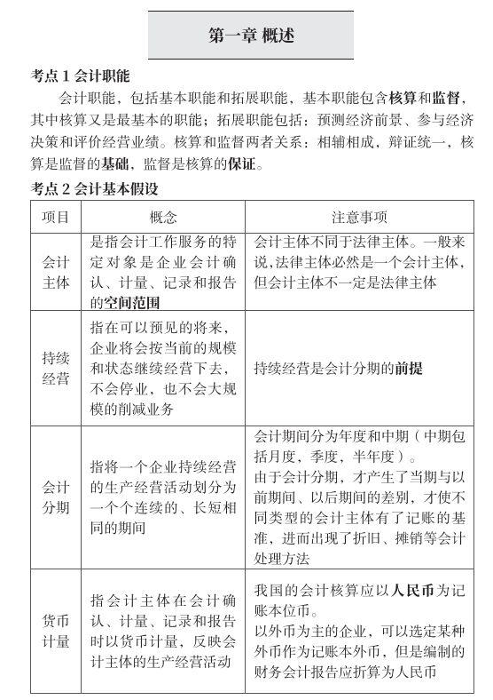 第一章主要包括会计的概念、职能和目标,会计的基本假设,会计的权责发生制和收付实现制;还有会计的信息质量要求、会计的职业道德、内部控制基础这几个重点。