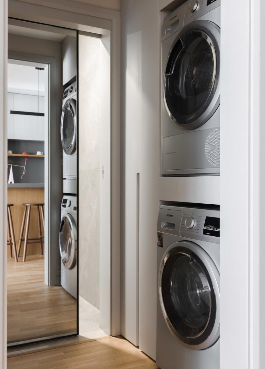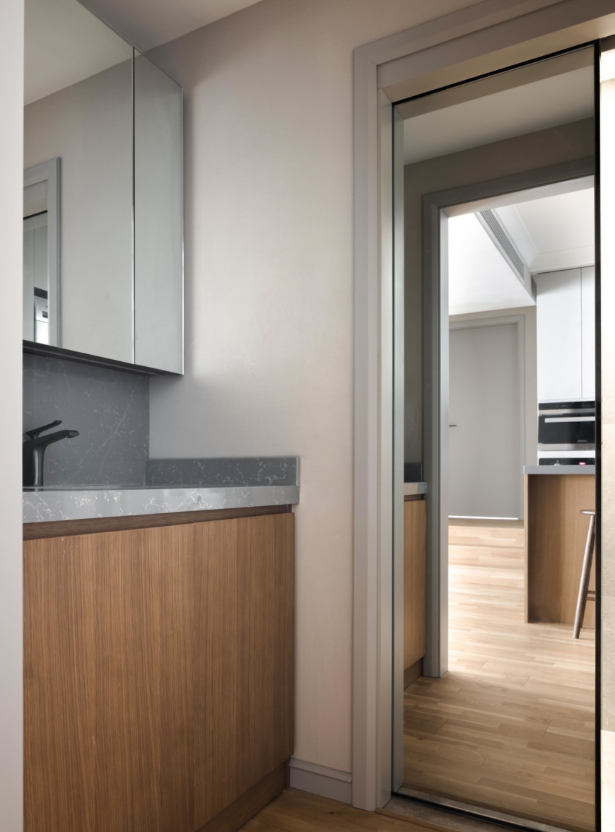 次卫生间在原有的基础上,做了常见的干湿分离结构,并在干区增加了洗衣设备。这样既释放了阳台的面积,又优化了使用体验。而将隔断移门做成镜面,也弥补了玄关区没有全身镜的尴尬。