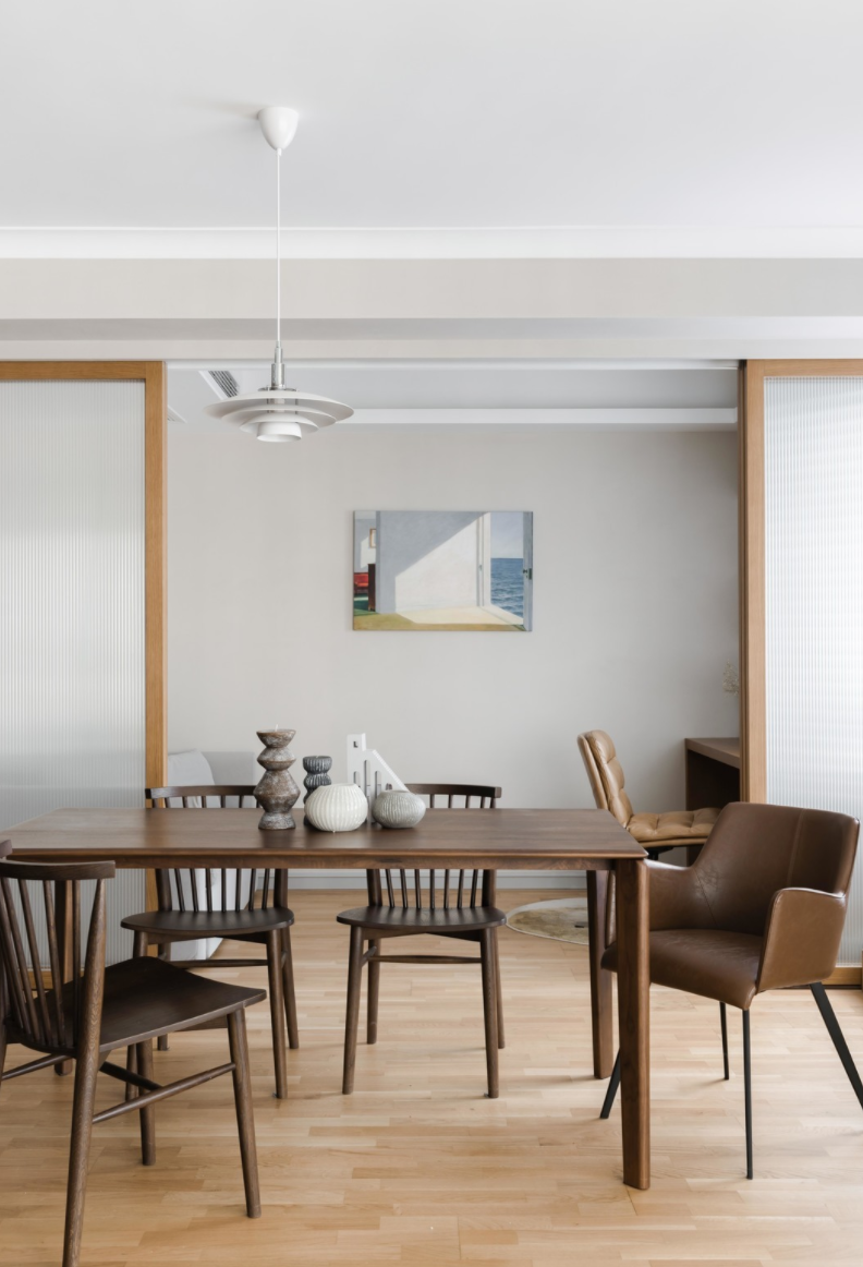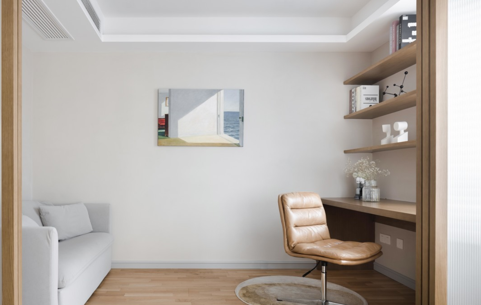 当书房缩小之后,则将门洞调整到了餐厅这边,并通过移门隔断,再一次拓展了空间感,且在在生活中还做到了开合自如。而书房内部小体积的沙发配置,也为屋主在办公之余,提供了一块舒适的小憩角落。