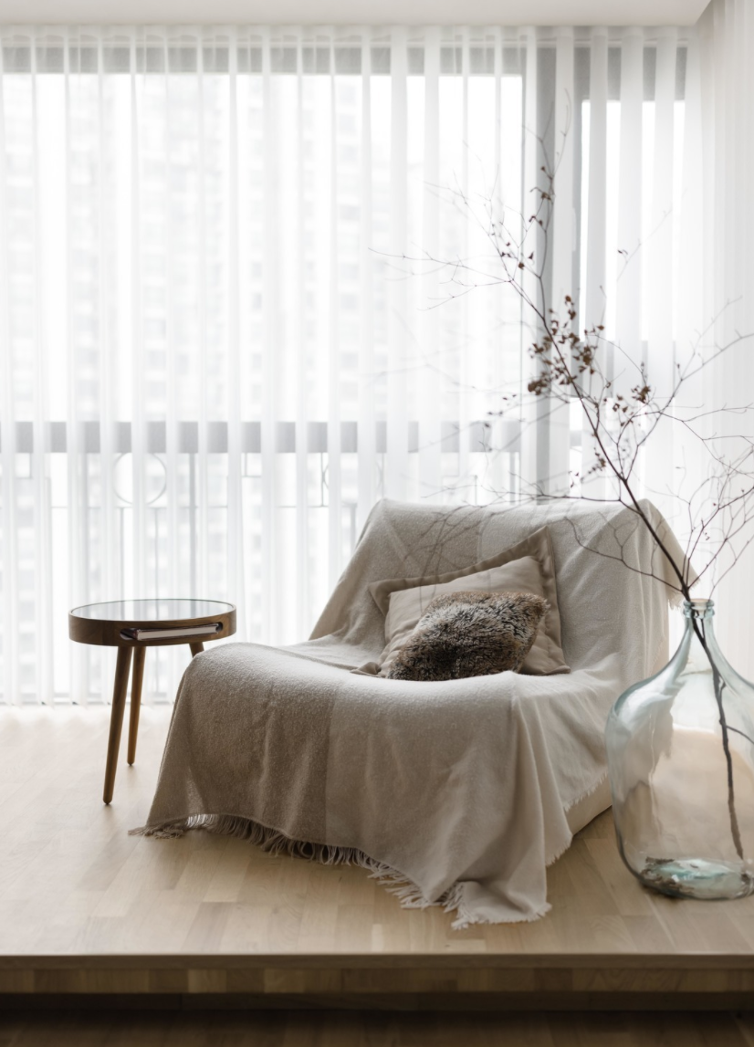 当南阳台纳入室内之后,整体做抬高处理,并摆放一张休闲椅,既在视觉上打破了边界,又将惬意、慵懒的生活姿态,展现得淋漓尽致。