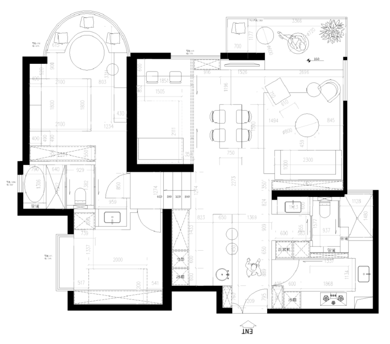 3、次卫生间向小阳台扩大,并做干湿分离,融合家政功能。